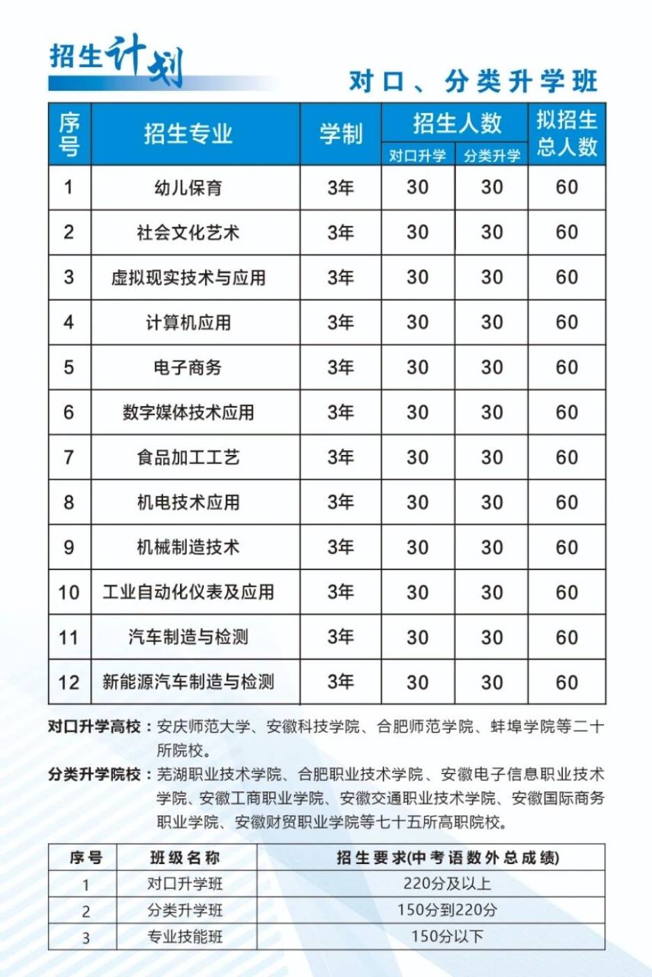 2019年起我校与蚌埠学院开展专科、对口本科、专升本教育教学工作,拓宽中职升学渠道,构建中高职贯通培养新范式。